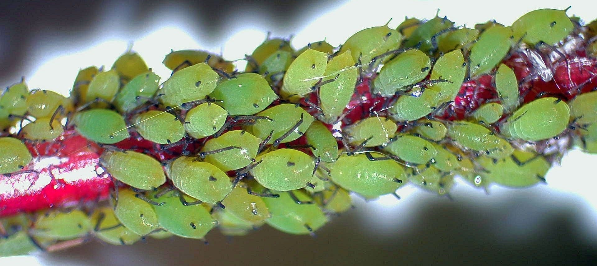 Ha már belőle írtam a szakdolgozatomat és doktori értekezésemet, itt is szeretném megemlíteni a zöld gyöngyvessző levéltetűt (Aphis spiraecola), amely inváziós fajként nagyjából 50 éve terjed Európában, és elsősorban a Mediterráneum citrusültetvényeiben okoz hatalmas károkat. Szubtrópusi eredetű, de a mérsékelt égövön gazdacserés faj: hazánkban gyöngyvesszőn telel tojás alakban, és a harmadik-negyedik generáció migránsai repülnek át az almára május-júniusban. Első hazai megjelenésekor kisebb riadalmat okozott, azonban így húsz év távlatában szerencsére kijelenthető, hogy kártétele semmivel sem súlyosabb, mint az őshonos zöld almalevéltetűé (A. pomi), melytől szabad szemmel meg sem lehet különböztetni.
