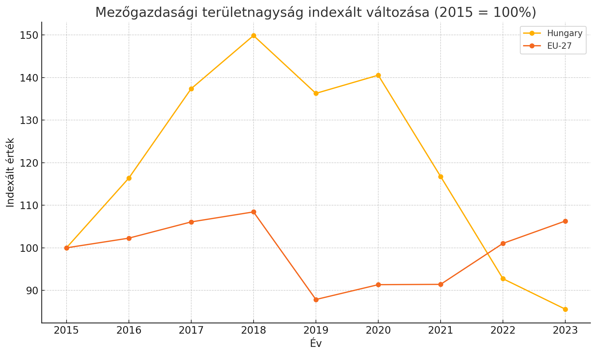 A következő ábra a repce termőterületének százalékos változását mutatja a 2015-ös bázisévhez viszonyítva. Látható, hogy Magyarországon és az EU-27-ben is 2018-ig a termőterületek növekedtek, majd 2019-ben hirtelen visszaesés következett be. Ezt követően azonban a két görbe eltérő pályát követ: míg Magyarországon a termőterület évről évre folyamatosan és meredeken zsugorodik, addig az EU-27 országaiban a visszaesés után stabilizálódik és alapvetően emelkedik a repce vetésterülete.