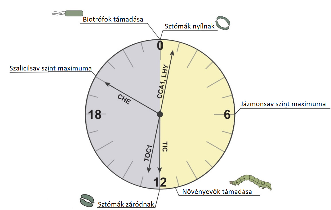 Fontos kiemelni, hogy ezeknek a hormonoknak a szintje is mutat napi fluktuációt, a szalicilsav az este közepén, míg a jázmonsav a nappal közepén tetőzik, a preferált fertőzési ablakok előtt, ezzel felkészítve a növényt a megfelelő védelmi válaszok kialakítására. Amennyiben ez a ritmus megbomlik, akkor a növény jelentősen csökkent rezisztenciát fog mutatni a különböző patogének ellen.