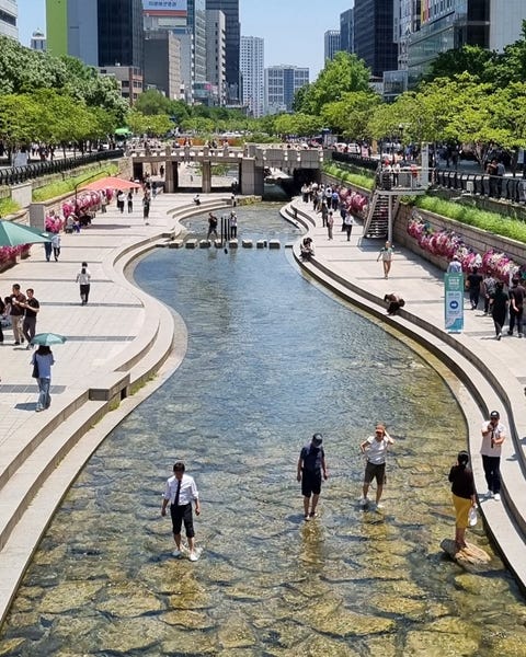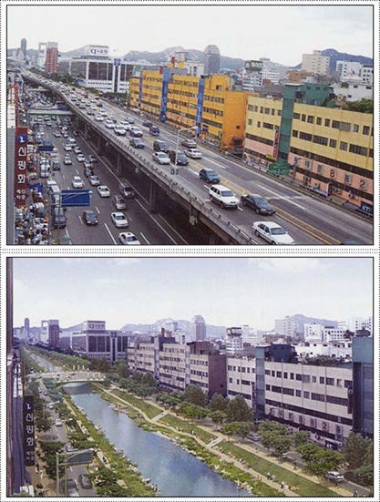 Az egyik jól ismert példa a dél-koreai Szöul városában található Cheonggyecheon [ejtsd: cshangícsan] folyó helyreállítása volt 2005-ben, amelynek betemetése már olyannyira előrehaladott állapotban volt, hogy autópályát is építettek fölé.